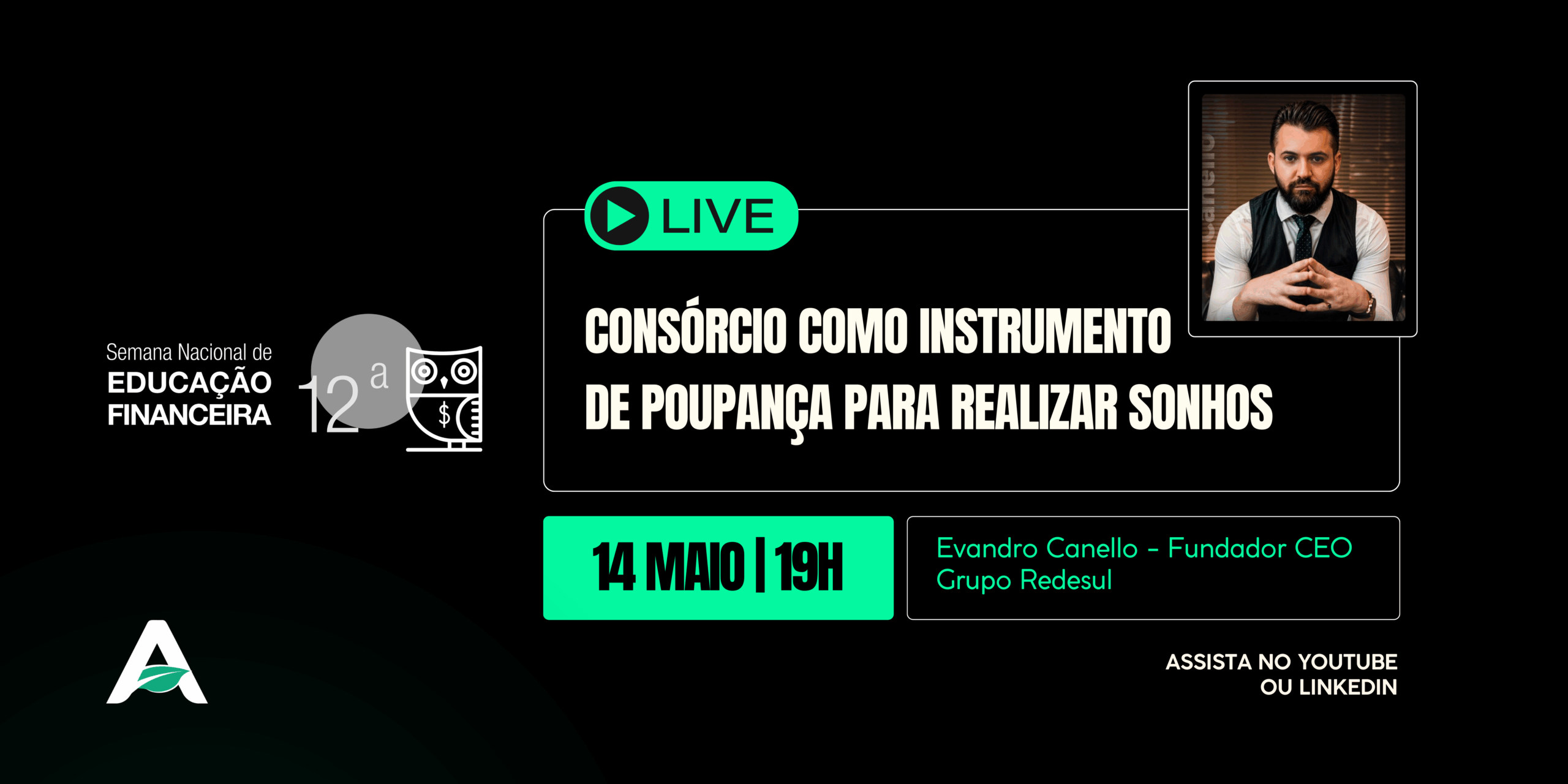 Às 19h – Consórcio como Instrumento de Poupança para Realizar Sonhos com Evandro Canello, fundador e CEO do Grupo da RedeSul
